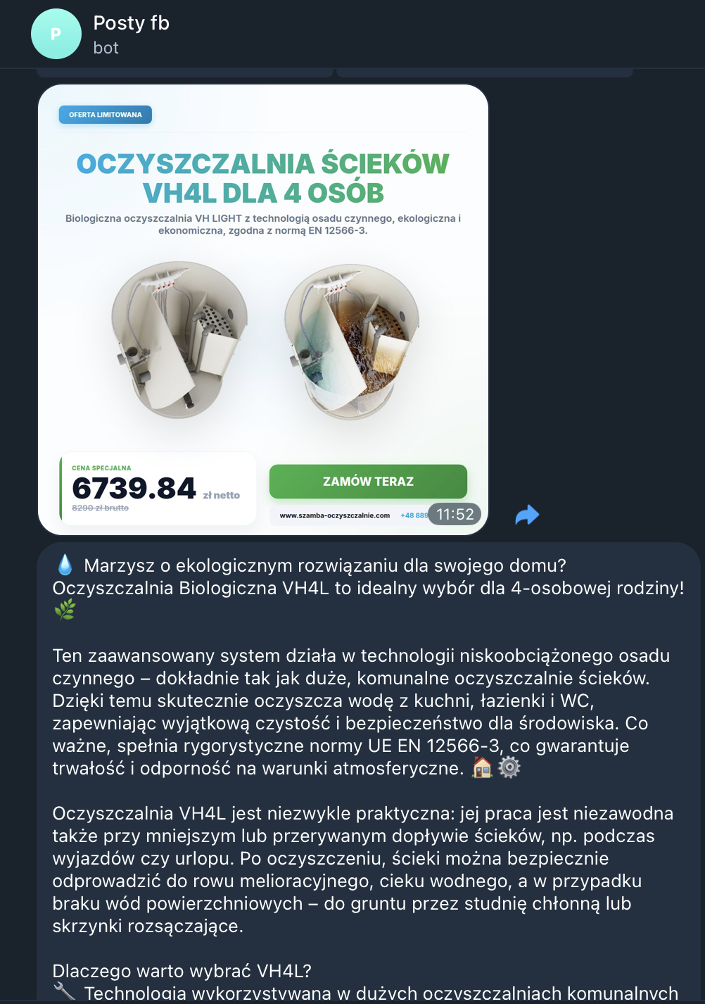 System działa autonomicznie: codziennie wybiera produkt z bazy, generuje unikalny opis (GPT-4), tworzy grafikę (Puppeteer) i... pyta mnie o zgodę. Wysyła mi gotowy post na Telegrama z przyciskami: "✅ Publikuj" i "❌ Odrzuć". Dzięki temu mam pełną kontrolę, poświęcając na to 5 sekund dziennie.