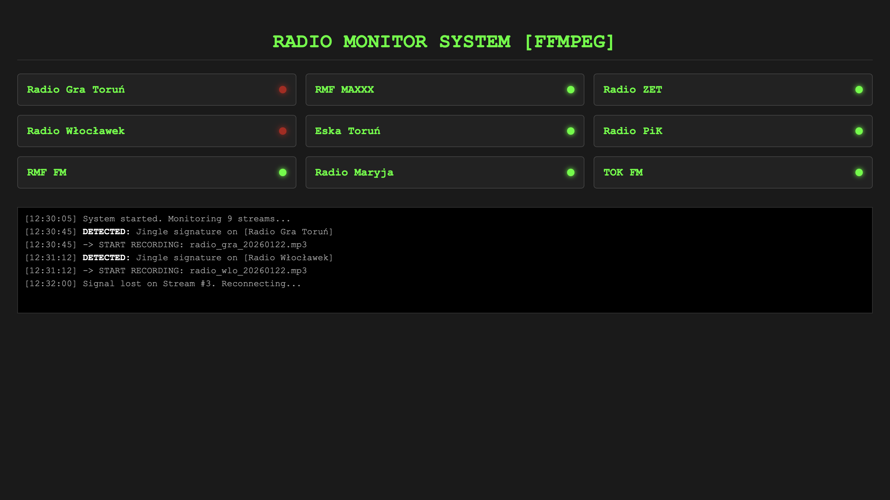 Sprzęt był za słaby na transkrypcję 24h na dobę. Zacząłem więc kombinować. Zrobiłem prosty player w HTML, żeby szybko skakać po stacjach, ale to było za mało. Wtedy przeczytałem ustawę o radiofonii. Znalazłem przepis: stacja musi oddzielić reklamę dżinglem. To był klucz.