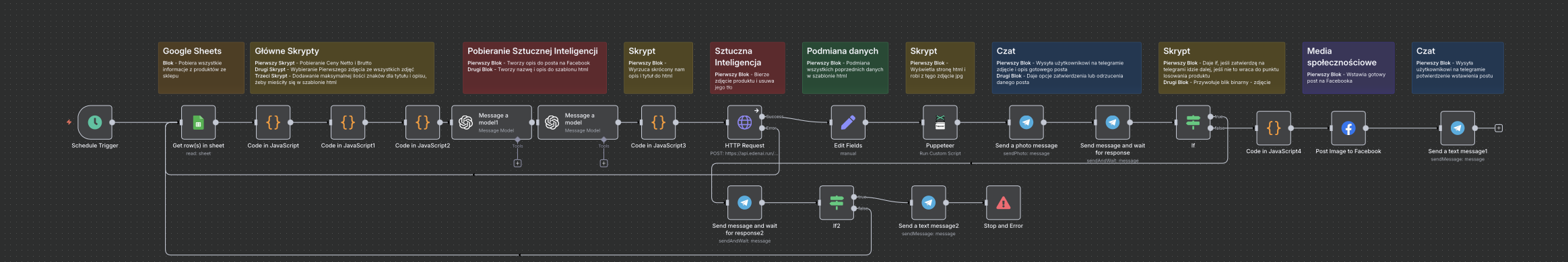 System działa autonomicznie: codziennie wybiera produkt z bazy, generuje unikalny opis (GPT-4), tworzy grafikę (Puppeteer) i... pyta mnie o zgodę. Wysyła mi gotowy post na Telegrama z przyciskami: "✅ Publikuj" i "❌ Odrzuć". Dzięki temu mam pełną kontrolę, poświęcając na to 5 sekund dziennie.