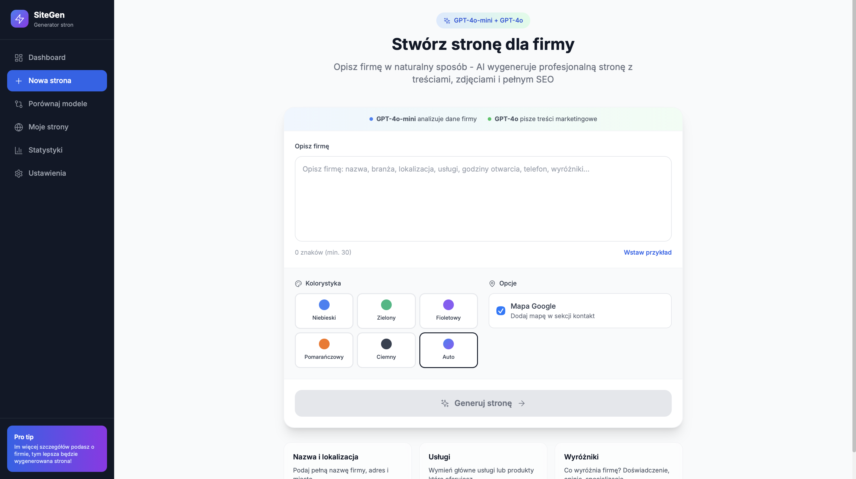 Jako freelancer zauważyłem, że nikt nie chce kupować "kota w worku". Dzwonienie z ofertą strony WWW nie działa. Napisałem SiteGen (Next.js + AI). Wpisuję nazwę firmy z Google Maps, a system generuje kompletną stronę i wrzuca ją na tymczasowy FTP (ważny 7 dni).